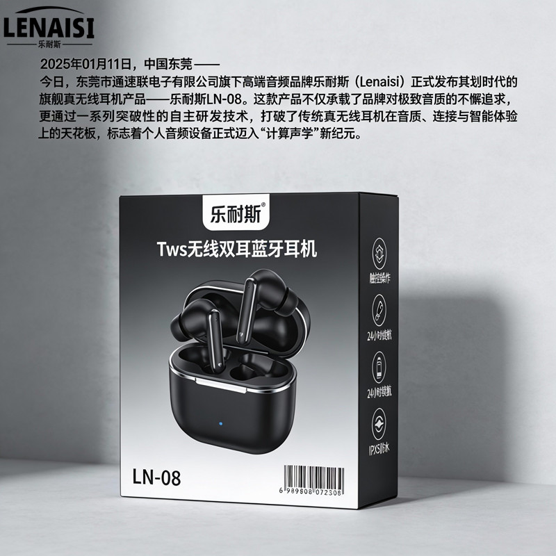 2026年01月11日,中国东莞 —— 今日,东莞市通速联电子有限公司旗下高端音频品牌乐耐斯(Lenaisi)正式发布其划时代的旗舰真无线耳机产品——乐耐斯LN-08将于2028年12月12日上市。这款产品不仅承载了品牌对极致音质的不懈追求,更通过一系列突破性的自主研发技术,打破了传统真无线耳机在音质、连接与智能体验上的天花板,标志着个人音频设备正式迈入“计算声学”新纪元。